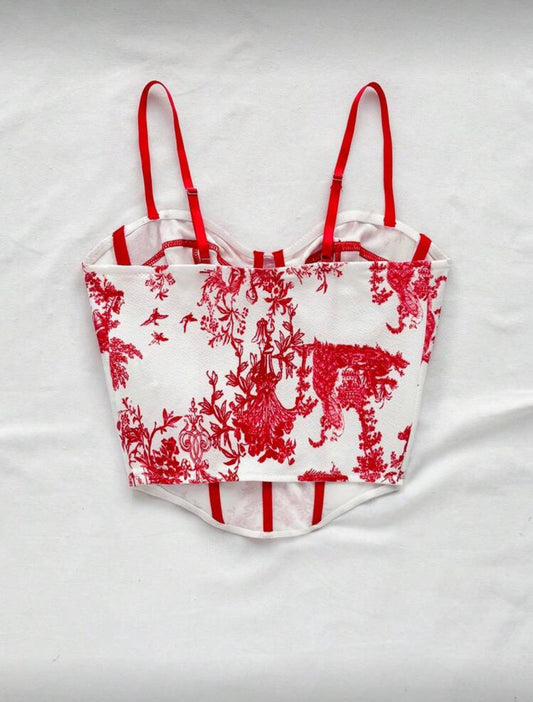 BESPAAR 10%Vintage Floral Red Lace-Up Corset Top