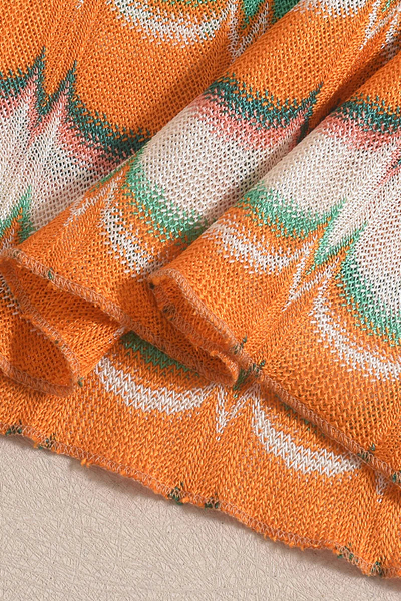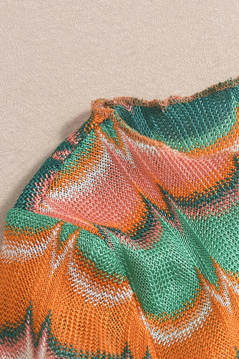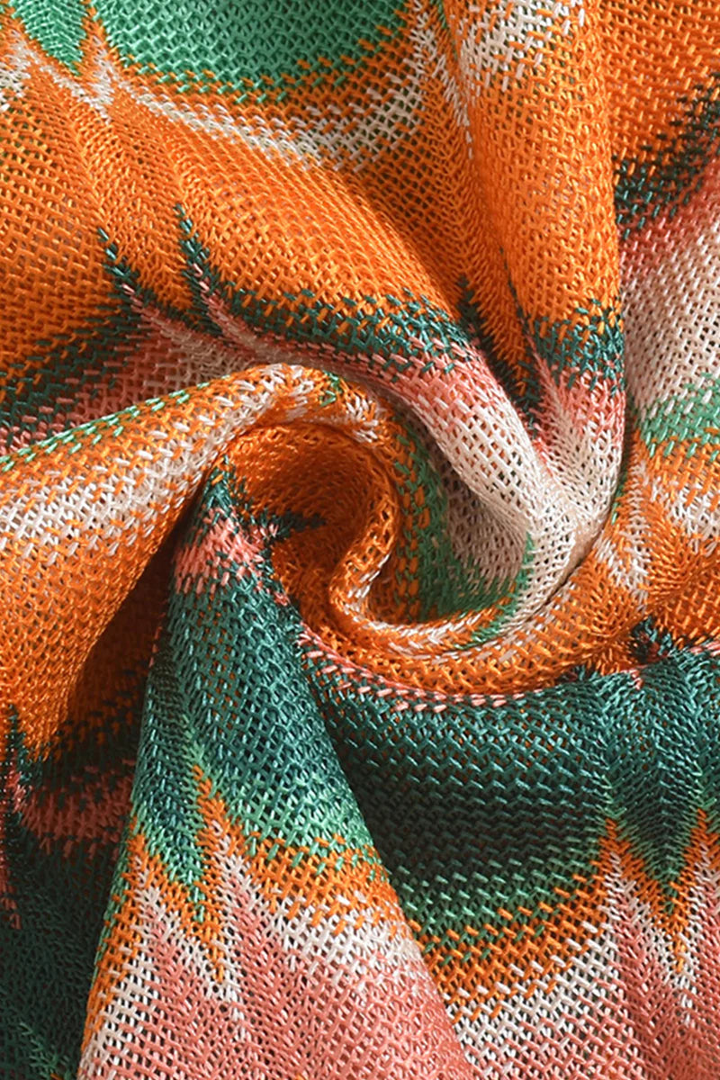 The cropped top features long sleeves and a trendy cut out design at the waist, paired with a high waisted mini skirt. The eye catching wavy pattern in vivid orange, green and white is a true head turner. Made from soft, stretchy fabric for all - day comfort. Whether it's a beach day or a night out.