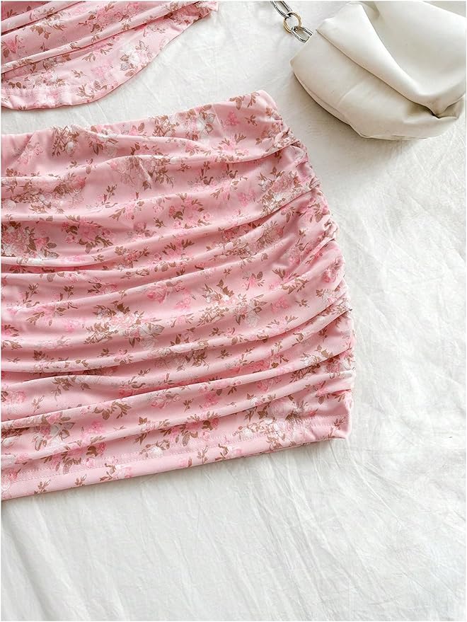Two Piece Floral Print Ruched Crop Tank Top and Bodycon Skirt Set